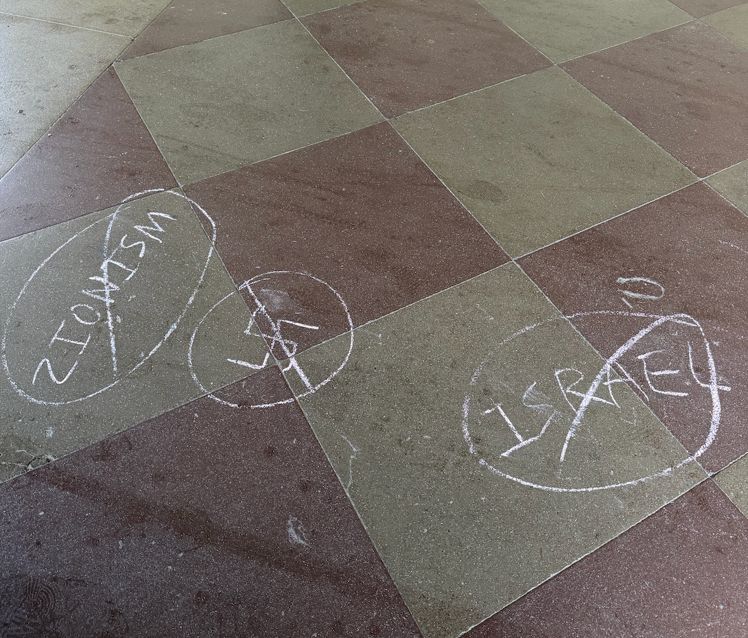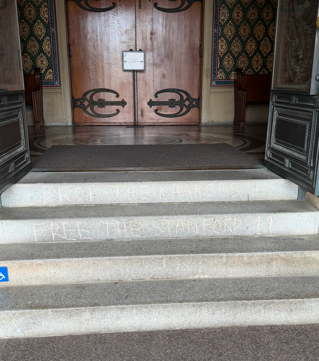 On Thursday morning, Memorial Church’s steps and entrance were defaced with antisemitic imagery. Chalk on the stairs read “DROP THE CHARGES” and “FREE THE STANFORD 11,” referring to students facing disciplinary action for breaking into and defacing the President’s office and hospitalizing a public safety officer to spraypaint pro-Palestine messages. Outside the entrance, someone had drawn a swastika alongside the words “ZIONISM” and “ISRAEL,” all circled and crossed out, ironically equating the Jewish state with Nazism.