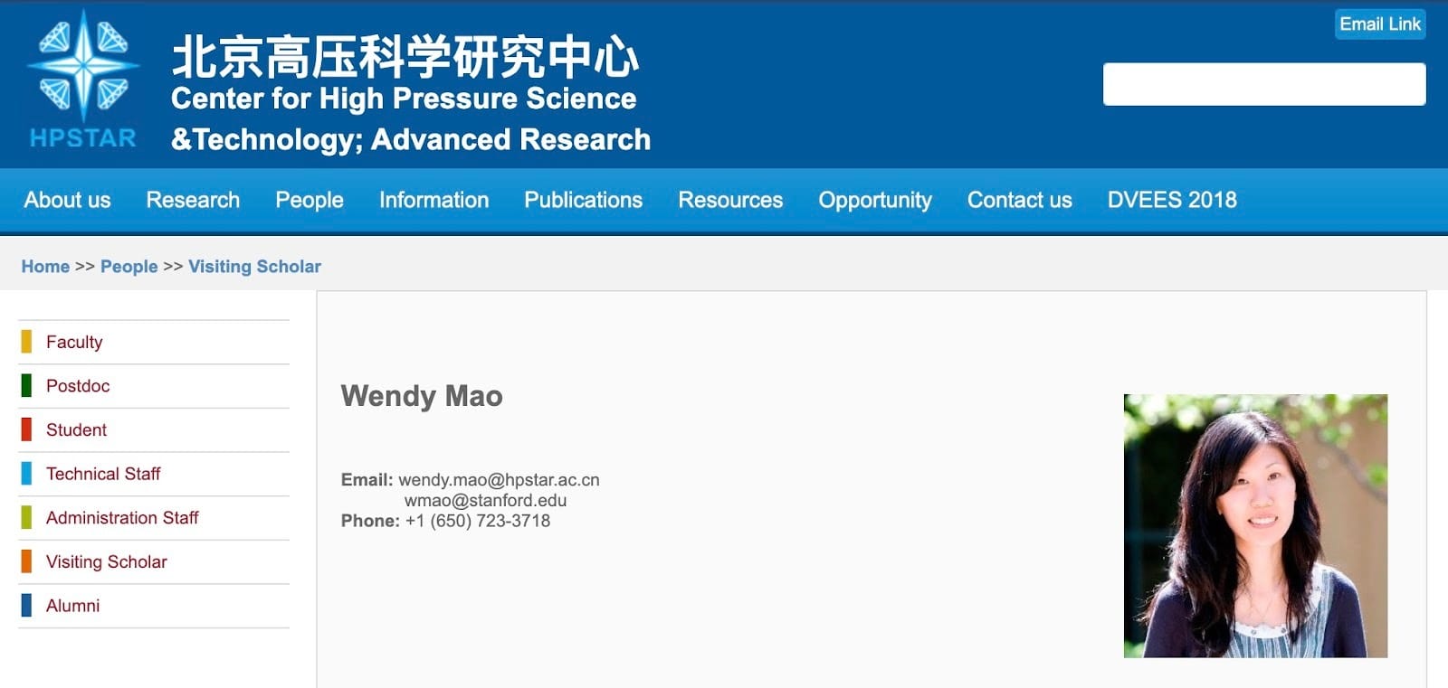 Mao served as a visiting scholar at HPSTAR’s Shanghai laboratory from at least 2016 to 2019. She also maintains a HPSTAR email address. Her internal Stanford CV and profile list 43 affiliations, but they do not disclose her position at HPSTAR.