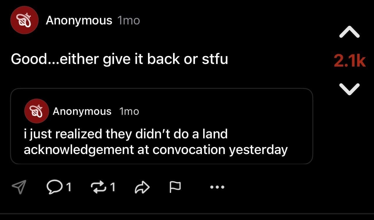 It is worth noting the strong language of this wildly popular Fizz post. This is no mild expression of annoyance; these two thousand students are sick and tired of land acknowledgments, enough to celebrate the suspension of the practice at convocation this year.