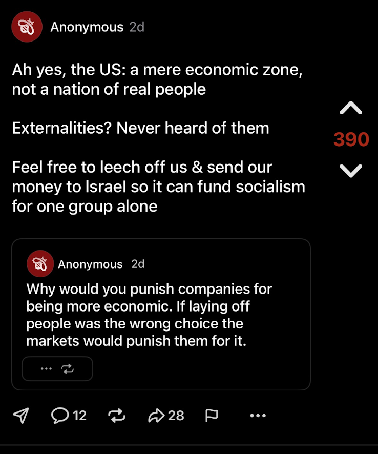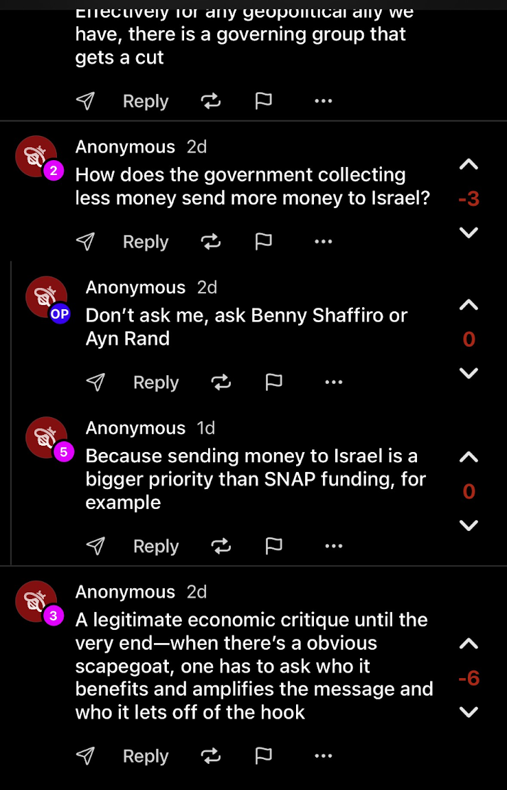 Comments criticizing the antisemitic portion—even those agreeing with the original post’s economic ideology—gained more downvotes than upvotes: