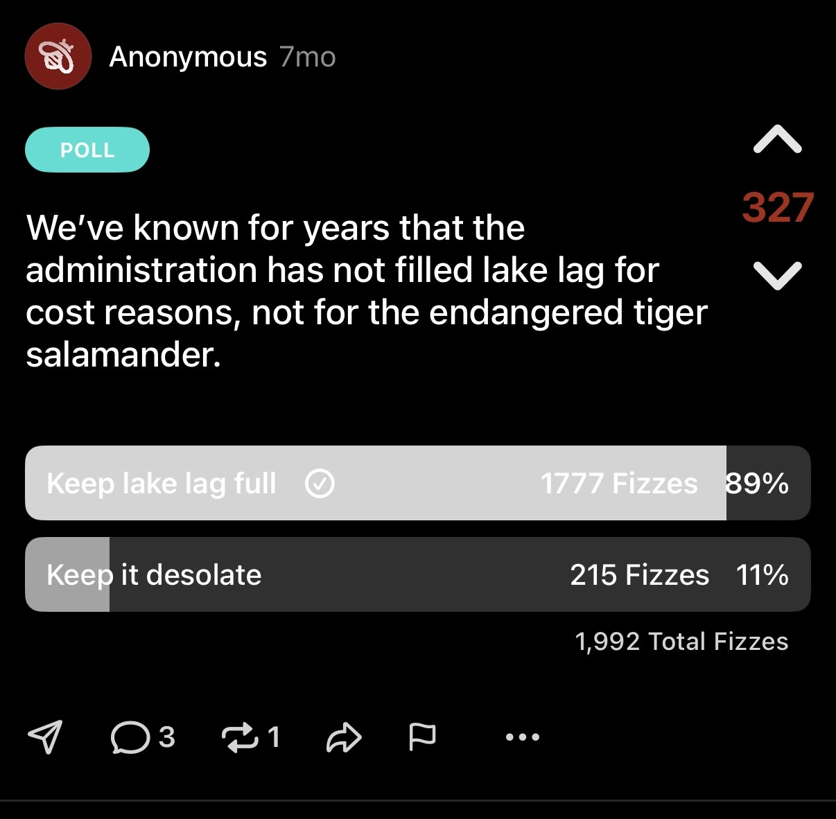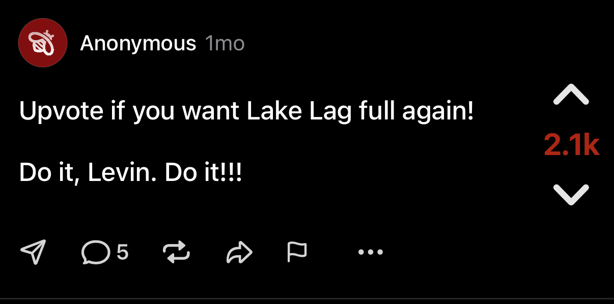 Refilling the lake is deeply popular among Stanfordians. Students regularly take to Fizz (a Stanford-exclusive, anonymous social media app) to advocate for Lake Lagunita, receiving thousands of upvotes: