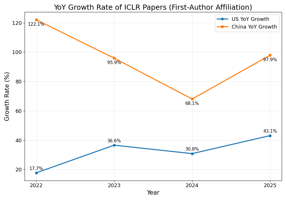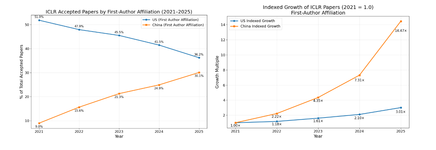 This shift from derivative work to genuine innovation shows up in the numbers. At ICLR, one of AI’s three most prestigious conferences, the share of Chinese papers has surged: outnumbered 5-to-1 by American papers in 2021, Chinese papers are almost equally numerous in 2025. The same pattern holds at NeurIPS and ICML, the other two top AI conferences.